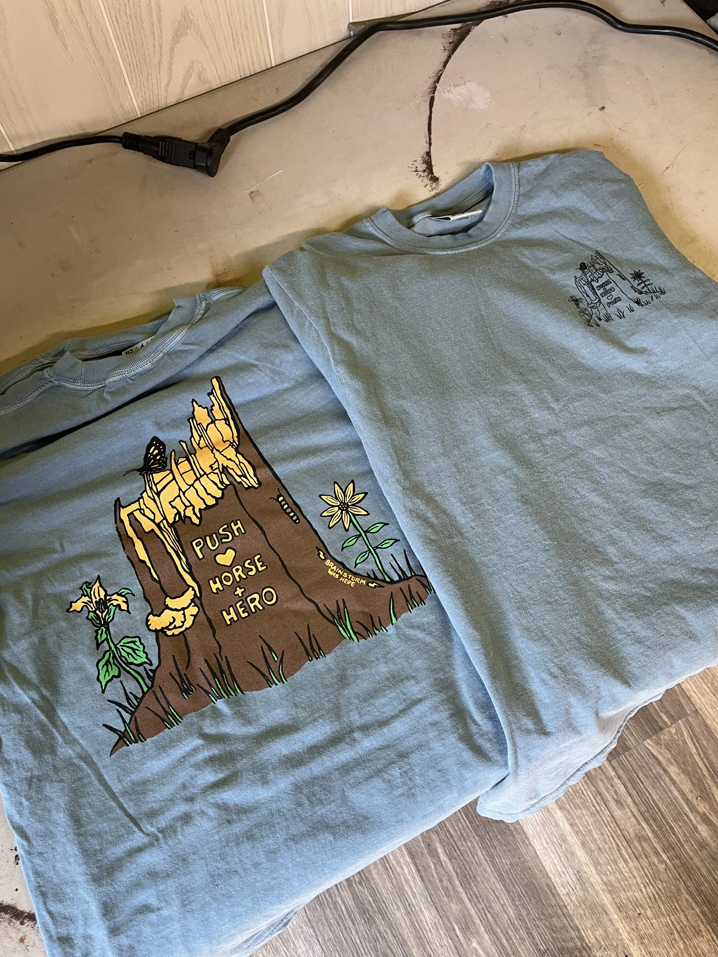 A custom 7 color front print on Dusty Blue shirts for Carolina Flowers based out of Marshall, NC. For a quote please contact crescentmoonprinting@gmail.com